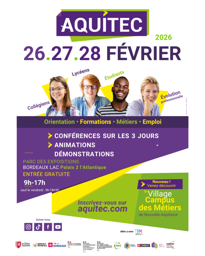 L’inscription gratuite et obligatoire se fait sur notre site internet https://aquitec.com/ et permet aux jeunes et leurs parents de télécharger leurs badges d’accès afin de faciliter leurs entrées sur le salon.