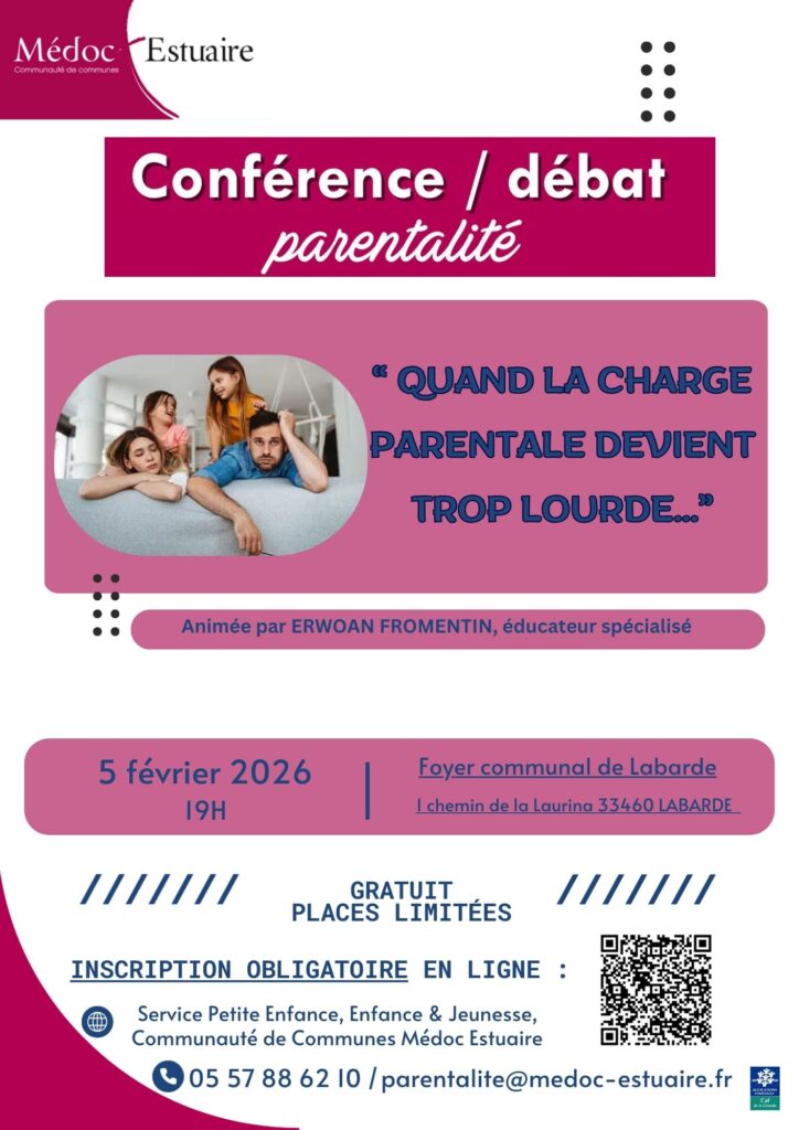 La première conférence est organisée sur 5 février à 19h à Labarde (Foyer Rural) sur la thématique de la surcharge parentale car de nombreux parents jonglent chaque jour entre leurs rôles à la maison, au travail et dans leur vie personnelle. Cette charge mentale constante, combinée au stress et à la fatigue, peut mener à une saturation parentale, un état d’épuisement qui affecte le bien-être de toute la famille.