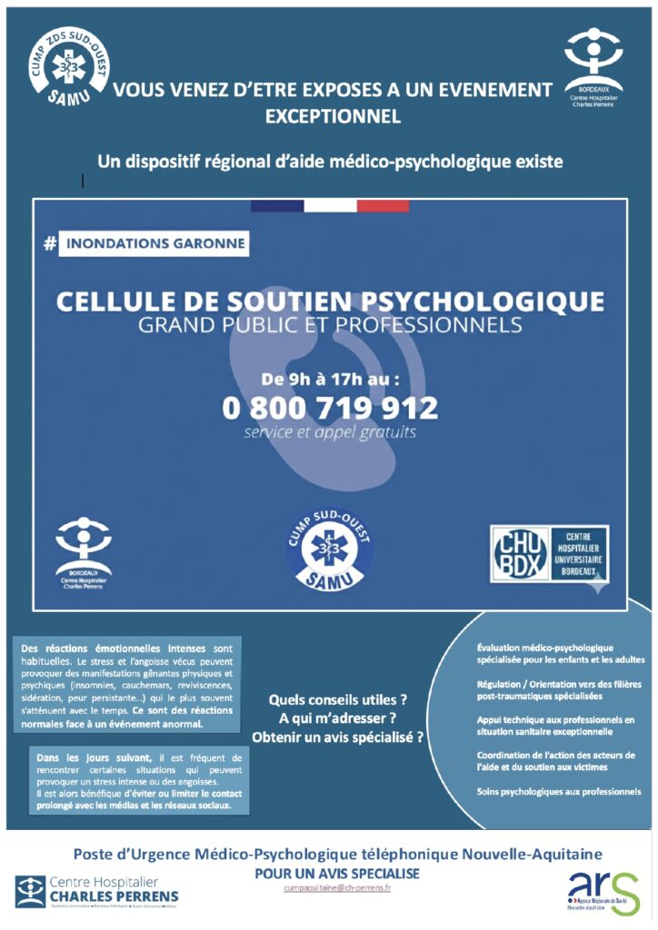 Dans le cadre des intempéries et en particulier celles liées aux inondations, le SAMU 33 a mis en place un dispositif régional exceptionnel d'aide médico-psychologique.