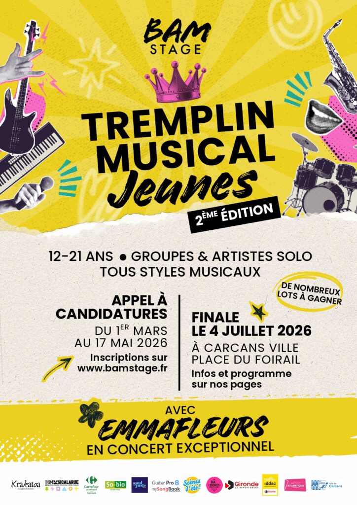 Inscriptions Tremplin Musical Jeunes Carcans jusqu’au 17/05/2026 Entrez le mot recherché ci-dessus, le résultat s'affichera sur fond jaune dans la page.