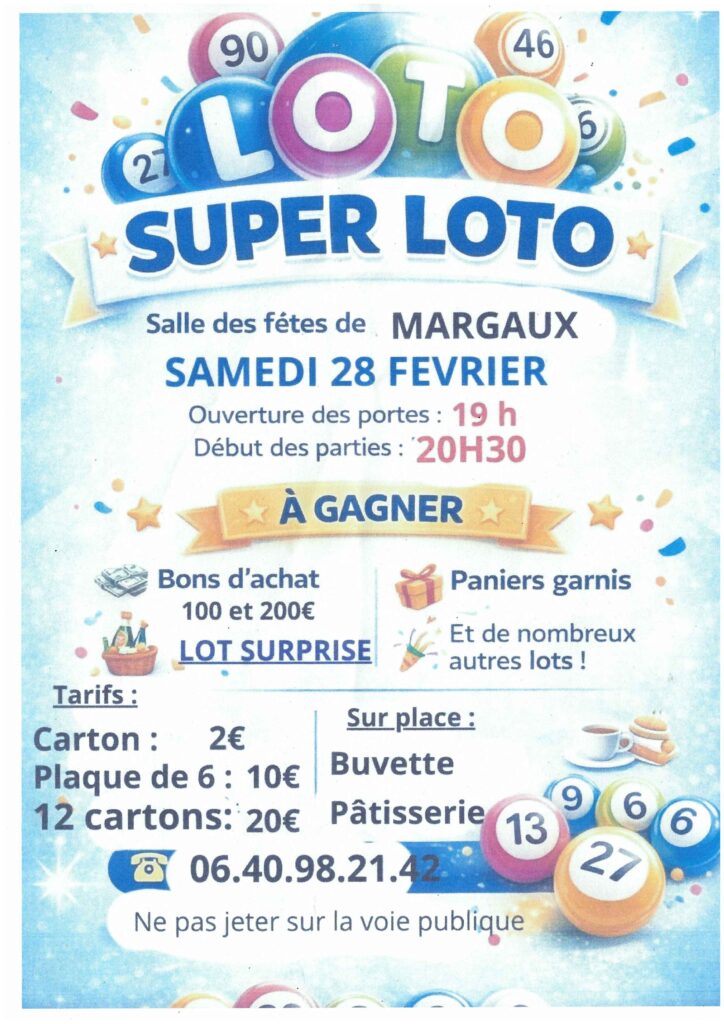 Loto – Comité des fêtes 28/02/2026 L'association du comité des fêtes organise un loto le samedi 28 février 2026 à partir de 19h00 à la salle des fêtes. Entrez le mot recherché ci-dessus, le résultat s'affichera sur fond jaune dans la page.