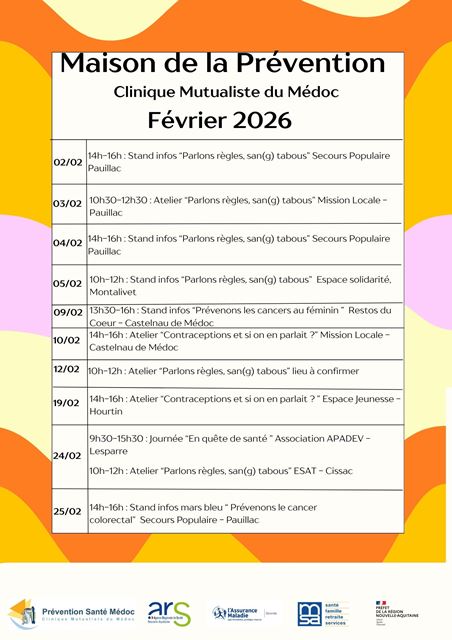 Maison de la prévention – Planning février 2026 Entrez le mot recherché ci-dessus, le résultat s'affichera sur fond jaune dans la page.