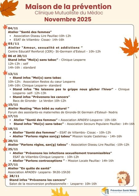Maison de la prévention – Programme Novembre 2025 Entrez le mot recherché ci-dessus, le résultat s'affichera sur fond jaune dans la page.