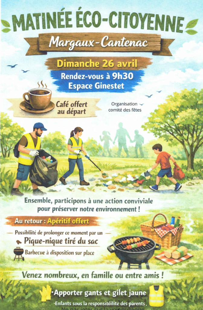 Rendez-vous à l'espace Bernard Ginestet le dimanche 26 Avril 2026 à 9h30 pour une matinée éco-citoyenne conviviale et participative.