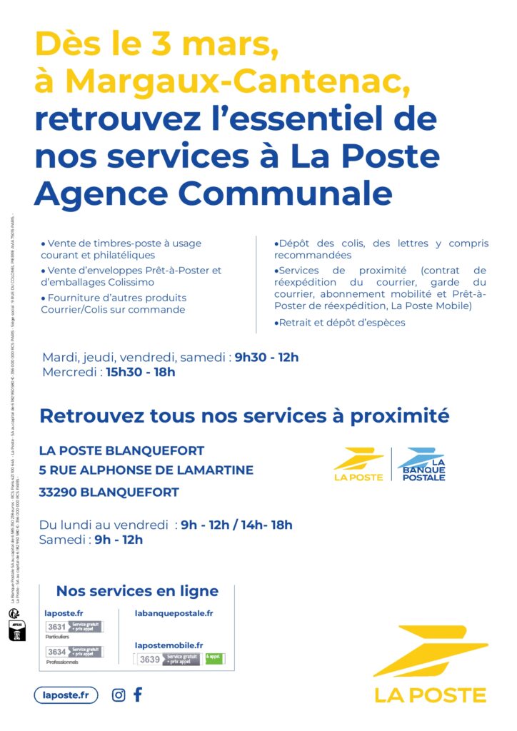 Le 19 Juin 2025 en conseil municipal, la Mairie avait décidé de reprendre les services de la Poste suite à la fermeture définitive de notre agence de Margaux-Cantenac décidé par la direction de la Poste.