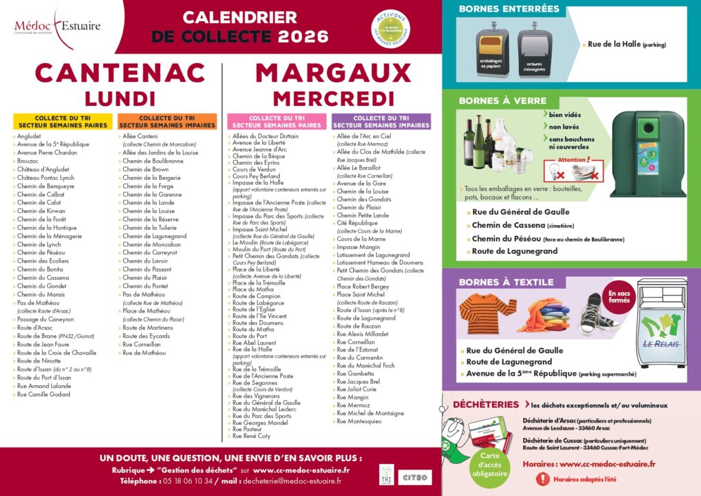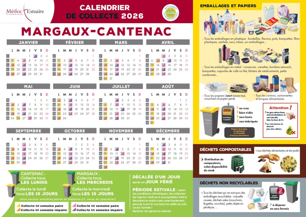 Les ordures ménagères (bacs gris) sont collectés une fois par semaine. Attention: les lundis, côté Cantenac et les mercredis, côté Margaux.