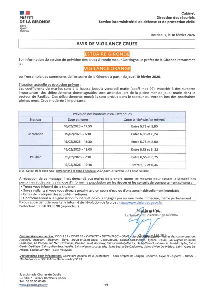 Suite aux informations du service de prévision des crues, la Préfecture prend un avis de vigilance orange crues pour l'estuaire de la Gironde.