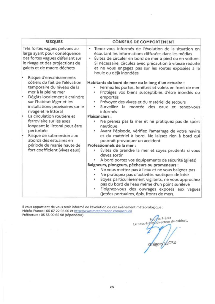 La Préfecture de la Gironde, au regard des informations météorologiques, place le Département en alerte vigilance orange "vagues submersion".