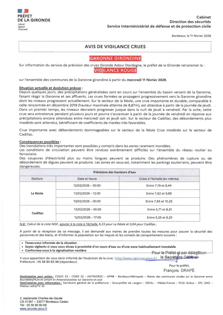 Vigilance Rouge – Crues à partir du 11/02/2026 Suite aux informations du service de prévision des crues, la Préfecture prend un avis de vigilances rouge crues pour la Garonne Girondine. Entrez le mot recherché ci-dessus, le résultat s'affichera sur fond jaune dans la page.
